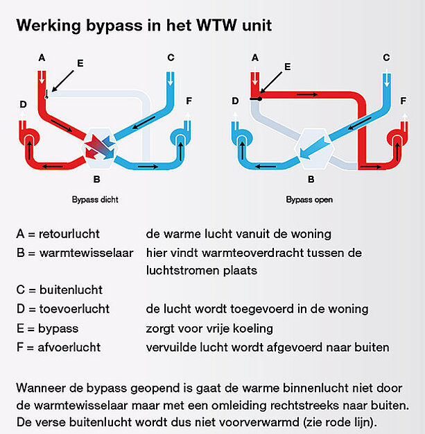 Als de buitentemperatuur in de zomer kouder is dan de binnentemperatuur, opent de bypass.