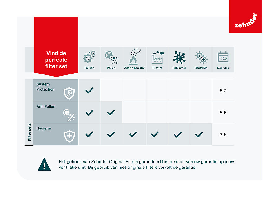 Door het gebruik van originele filters van Zehnder helpt u ook de levensduur van uw ventilatiesysteem te verlengen, waardoor er minder onderhoud nodig is en uw systeem jarenlang probleemloos werkt.