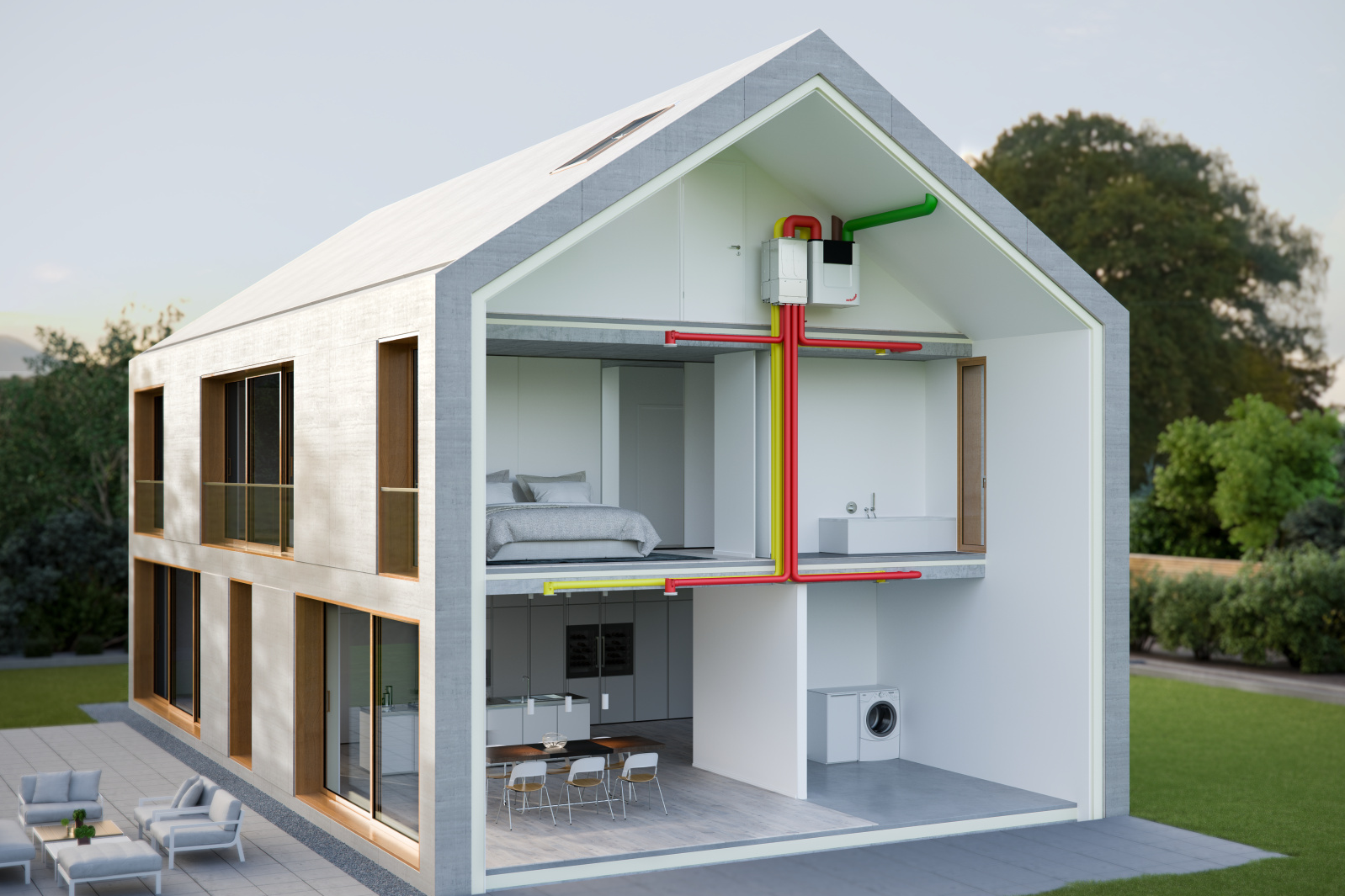 Naast de stille werking, is een balansventilatie-unit de meest energie-efficiënte keuze. Ten eerste omdat de machine zelf weinig energie gebruikt. Maar ook omdat balansventilatie zorgt voor een lagere energierekening. In de winter verwarmt de uitgaande lucht namelijk de zuivere, binnenkomende lucht - en koelt het in de zomer. Er hoeft dus minder verwarmd of gekoeld te worden. Bovendien is balansventilatie gezonder. Jerôme: “Er zijn geen raamroosters die je sluit omwille van de koude en daarna vergeet opnieuw te openen. De ventielen verspreiden constant zuivere lucht, zonder tocht. Balansventilatie bréngt dus ook energie.”