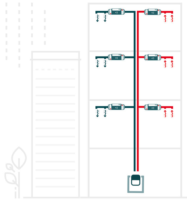 De ComfoAir Q kan buiten de appartementen geplaatst worden in een gezamelijk technische ruimte. Hierdoor is het niet nodig om voor onderhoud en het wisselen van filters de appartementen te betreden. Dit maakt het werk voor de installateur sneller, praktischer en minder storend.