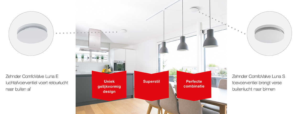 Met de Zehnder ComfoValve Luna-serie bereikt u het perfecte binnenklimaat op de meest comfortabele en elegante manier. Beide ventielen onderscheiden zich met hun subtiele, perfect afgestemde design. Dankzij de buitengewoon stille luchtstromen voldoen de ventielen aan de strengste eisen rond geluidsemissie en vermogen, terwijl ze tegelijk maximaal wooncomfort garanderen.